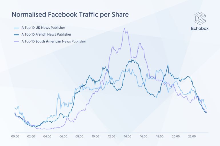 Interestingly, when two very similar publications in the same country are compared, their Facebook audiences seem to consume content at different times. These nuances help us understand the particular characteristics of audiences and their varying appetite for content at different times of the day. But even these descriptions of the individual publishers do not do the subtlety of the data justice.