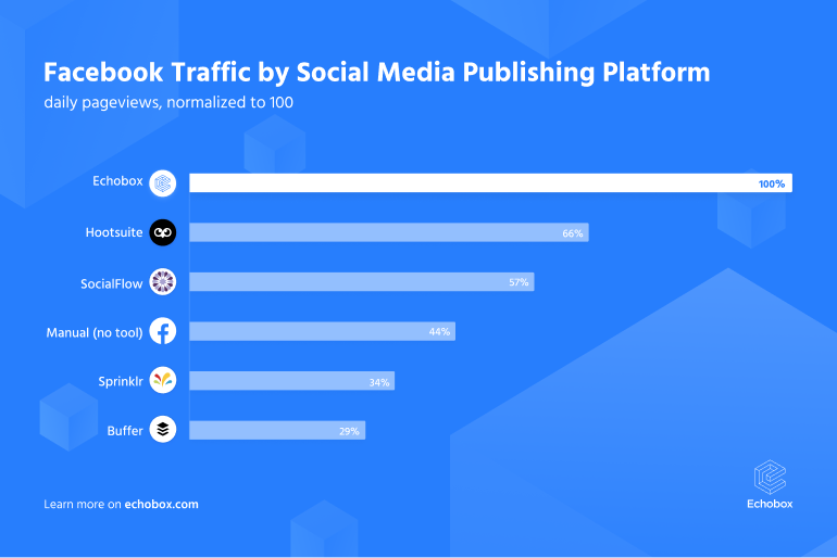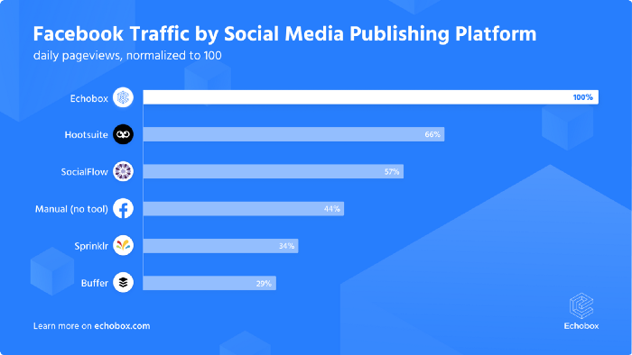 Compared to Hootsuite, Echobox drives 34% more daily Facebook pageviews.