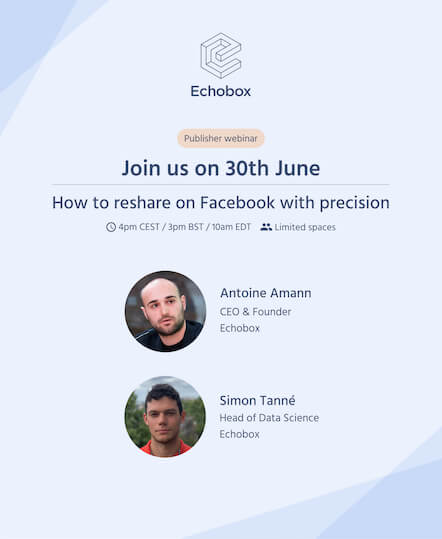 Watch this recorded webinar exclusively for publishers on how to reshare on Facebook with precision. Learn how to maximize your referral traffic by adopting a data-driven resharing strategy. Antoine Amann, Echobox CEO & Founder, and Simon Tanné, Head of Data Science, will share unique research on the untapped power of reshares. You’ll learn why resharing is critical and how to design a resharing strategy for your publication in this webinar moderated by Ashley Kibler, Echobox Senior content Marketing Manager.
